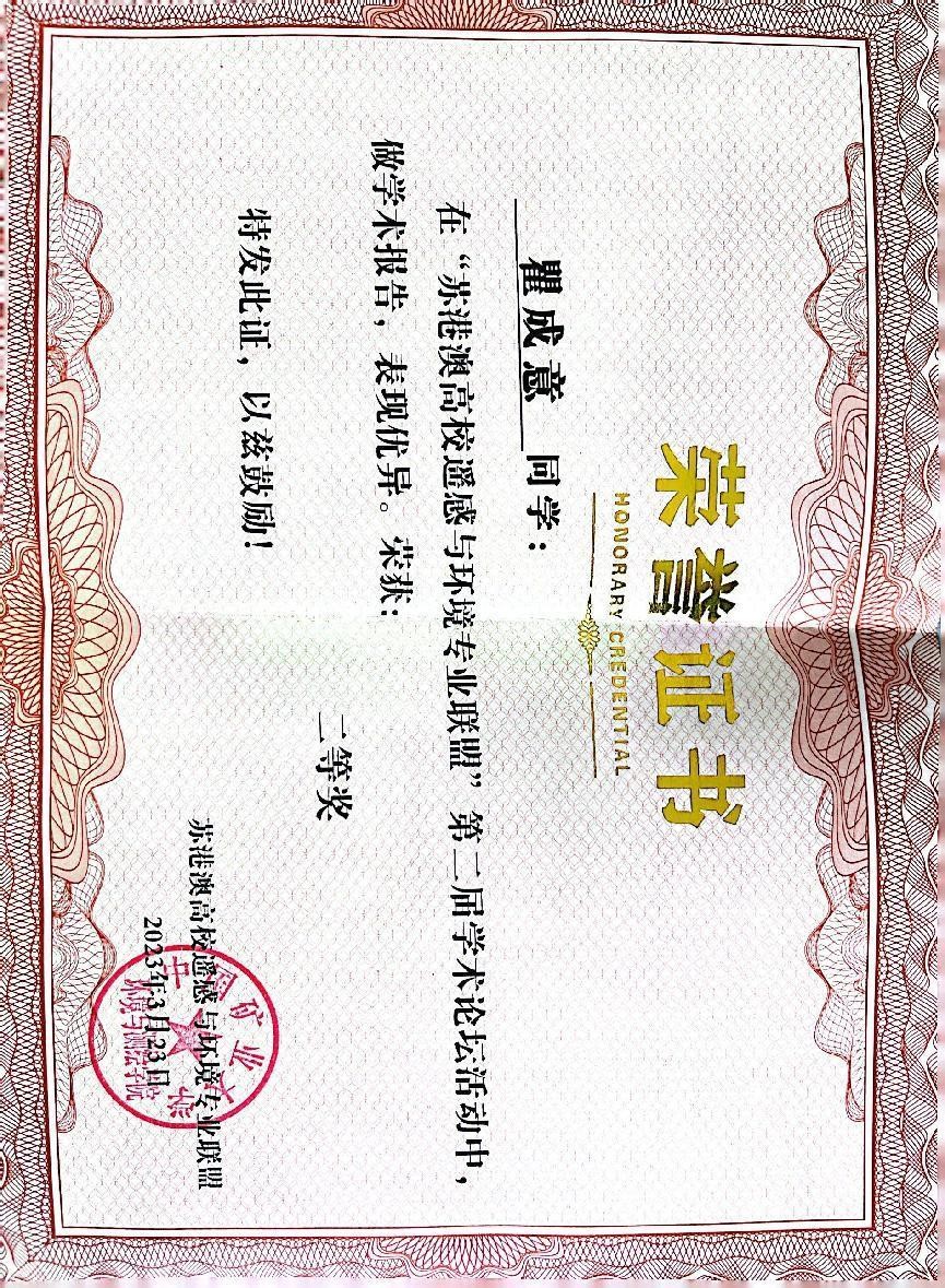 由苏港澳高校合作联盟、中国矿业大学、香港理工大学、澳门科技大学主办的“苏港澳高校遥感与环境专业联盟成立仪式暨第二届学术论坛”于2023年3月22日至2023年3月23日在中国矿业大学举办。来自南京大学、中国矿业大学、河海大学、南京信息工程大学、bevictor伟德国际1946、南京师范大学、江苏师范大学及香港理工大学、澳门科技大学等多所高校的师生参加了论坛。本次论坛邀请有关学科专家对汇报内容进行了评审,我院资源与环境专业硕士生瞿成意、范金鼎均荣获二等奖。