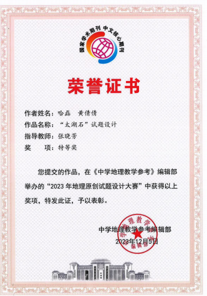 在中学地理教学参考举办的“2023年地理原创试题设计大赛”中,由我院张晓芳老师指导,哈磊、黄倩倩同学的《“太湖石”试题设计》喜获特等奖,杭锐同学的《“墨脱”试题设计》喜获二等奖,张晓芳老师获得优秀指导教师奖。