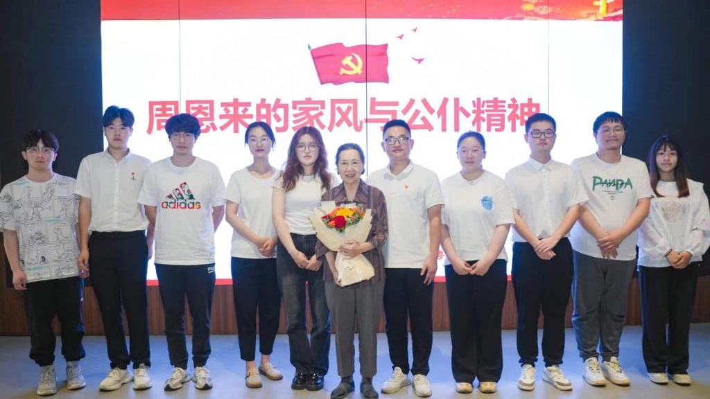 周秉宜是周恩来胞弟周恩寿的三女儿,与周总理在一起生活多年,从小受到一代伟人的熏陶培养。周秉宜围绕“总理家世”“总理家规”“总理亲情”“两个理想”四个篇章,以“家风家教”和”公仆精神”为主题,结合自己的亲身经历,通过多个小故事,用平实的语言、家常的故事、深沉的感情,为大家讲述了一个开国元勋、大国总理、伟大的共产主义战士的清廉家风和全心全意为人民服务的公仆精神,让大家感受到了一代伟人的廉洁修身、廉洁齐家。在讲到“十条家规”时,周秉宜深情地说,“这些家规是晚辈们总结出来的,伯父、伯母没有写在纸上,而是写进了晚辈们的心中。家规看着很‘严’,实则是他们对我们最真切、最深沉的‘爱’”。为了表达对周秉宜女士的欢迎和感谢,以及对周恩来总理的尊敬和怀念,学生党员代表向周秉宜女士献花并合影留念。