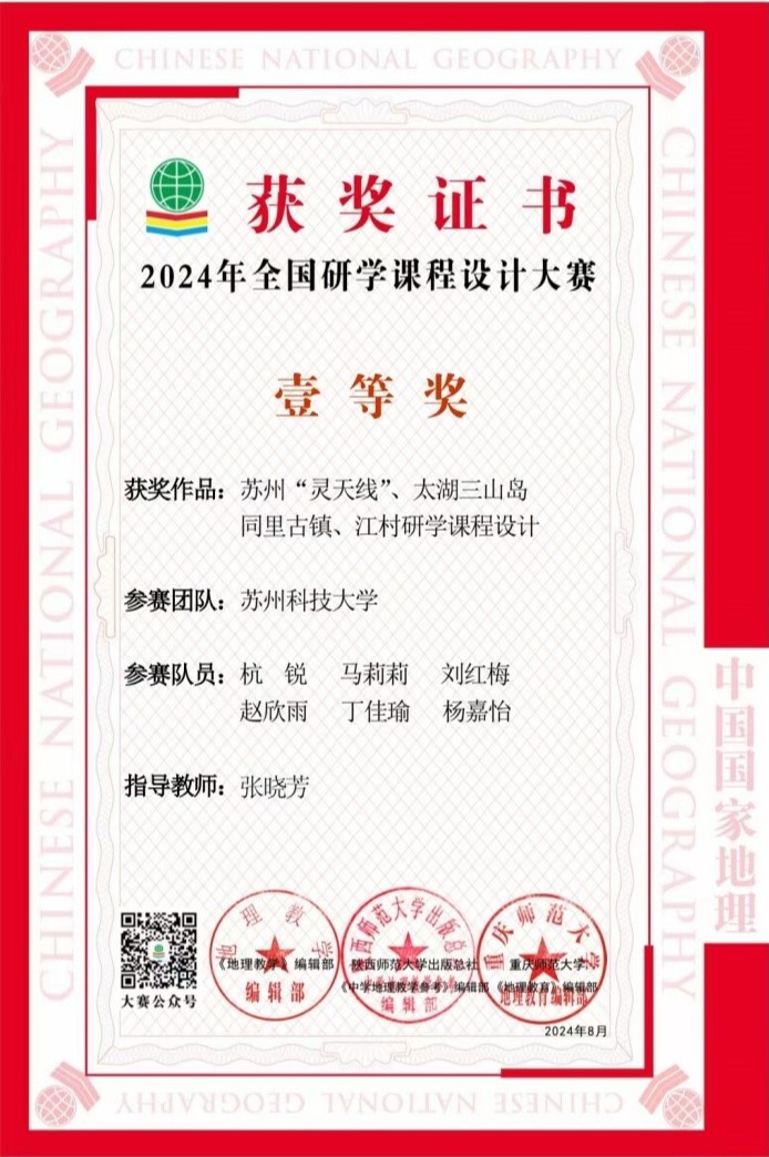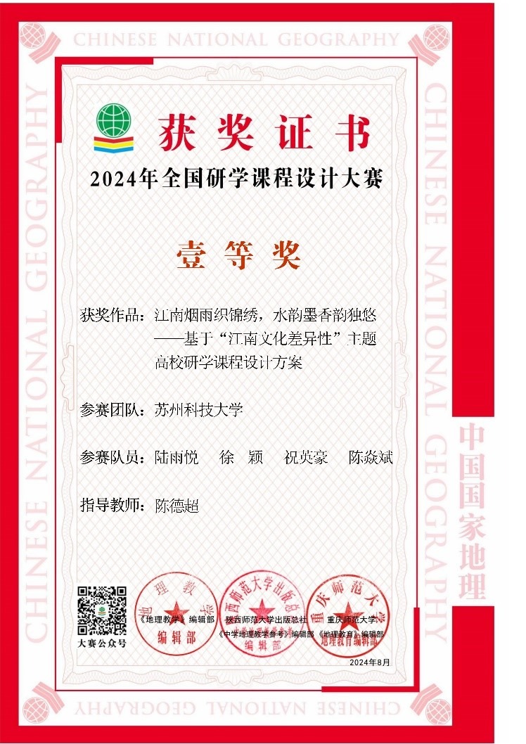 2024年全国研学设计大赛结果揭晓,我校伟德victor1946学生获得佳绩。陆雨悦、徐颖、祝英豪、陈焱斌同学完成的作品《江南烟雨织锦绣,水韵墨香韵独悠 ——基于“江南文化差异性”主题 高校研学课程设计方案》(指导教师:陈德超)和杭锐、马莉莉、刘红梅、赵欣雨、丁嘉瑜、杨嘉怡等同学完成的作品《苏州“灵天线”、太湖三山岛、同里古镇、江村研学课程设计》(指导教师:张晓芳)均获全国一等奖。此次获奖学生覆盖地理科学、地理信息科学、人文地理与城乡规划等所有地理学专业。