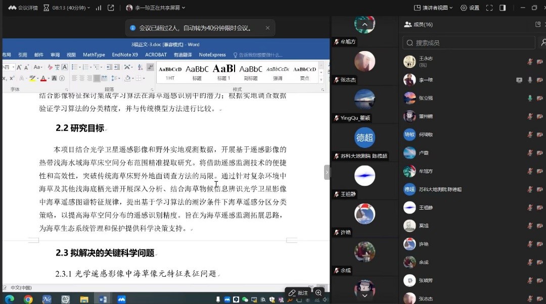 地理与测绘工程领域青年教师李一琼、杨琪淇、张志杰、何琦敏等就各自的研究领域和基金本子整体情况进行了简要阐述,之后两位教授就两位教师的基金选题、关键科学问题和可行性等多个方面进行了详细的点评,并结合基金委的评审要求提出了相应修改建议。几位青年教师与专家进行了深入的探讨和交流,他们纷纷表示,通过此次活动,不仅明确了基金本子的提升方向,还拓宽了自己的学术视野,这对于未来的研究工作将产生积极的影响,对学术成长和职业生涯将起到重要的推动作用。