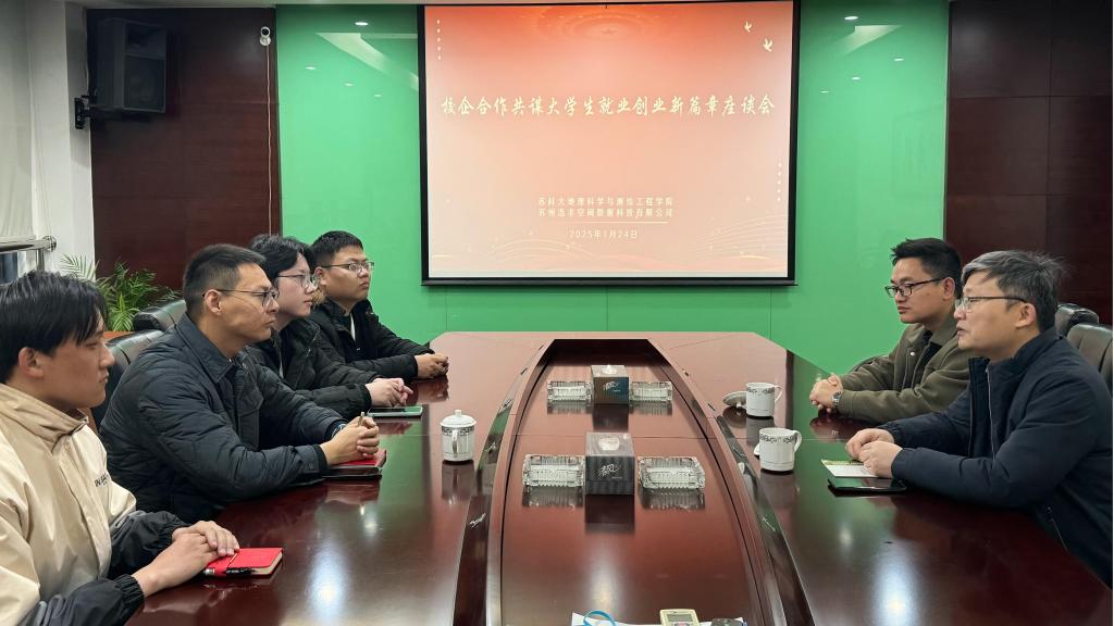 除深入交流外,学院与苏州世科环境发展有限公司、苏州一光仪器有限公司签订大学生就业创业基地。同时学院领导对正在苏州浩丰空间数据科技有限公司实习的学生进行了亲切慰问,详细了解学生的工作和生活情况,鼓励学生珍惜实习机会,将理论知识与实践相结合,不断提升自身的专业技能和综合素质。