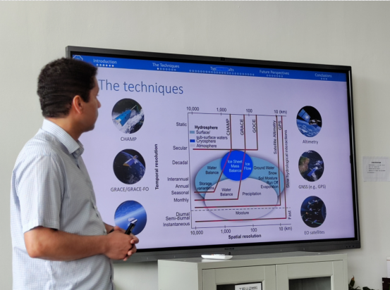 Vagner Ferreira教授的研究兴趣集中在增强和应用大地测量数据以进行水文监测和环境变化研究,并在国内率先开设了“环境大地测量学”本科生课程。此次来访,Ferreira教授以“Hydrogeodesy: unveiling the hidden depths of hydrology with geodetic sensors”为题进行了学术报告,对现代大地测量技术在水文学研究中的应用方法和技术难点进行了详细阐述,并分享了他在空间测量传感器数据处理方面的新方法和新技术,介绍了他目前正在开发的改进区域水储存反演的新算法。与会师生对报告内容产生了浓厚的兴趣,并就卫星重力数据的分辨率、水文反演中的误差等问题与Ferreira教授展开了交流与讨论。