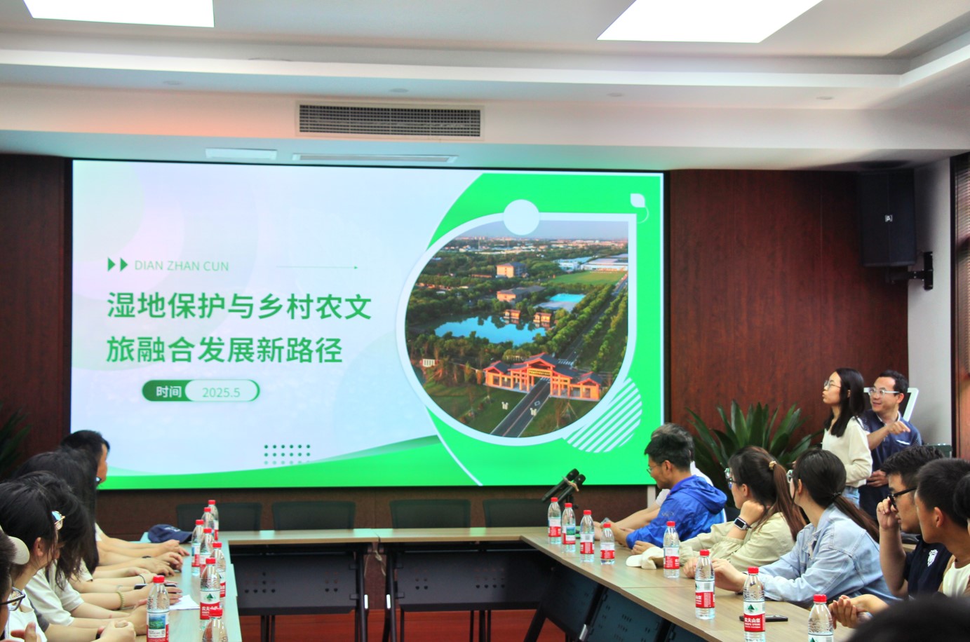 在东林村太仓市乡村振兴实践学院,负责人展示了以生态循环农业为核心的绿色发展模式。在万丰村湿地生态公园,负责人展示了该村从传统种植向“生态农田+湿地缓冲区”转型的案例。在电站村,师生聆听了主题为“湿地保护与乡村农文旅融合发展新路径”的专题报告。