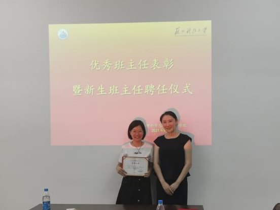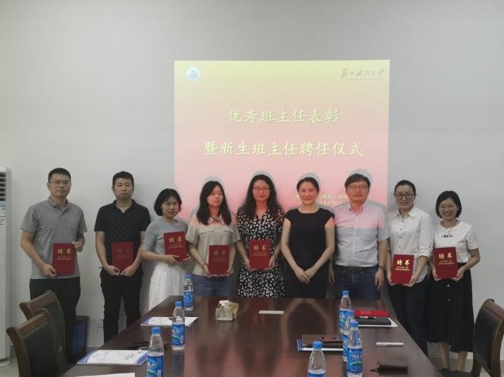 张菡和彭科共同为7名新生班主任颁发聘书并合影留念,张菡为余成老师颁发优秀班主任荣誉证书并合影留念。